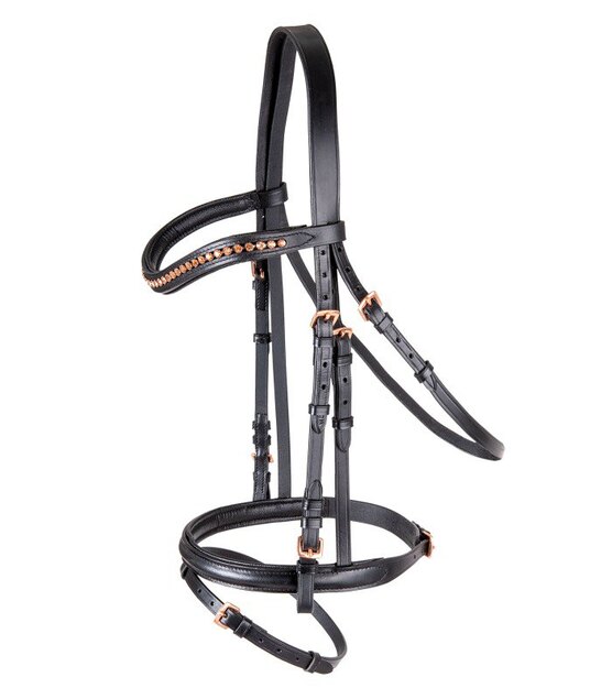 Капсюль и изогнутый налобный ремень с мягкой подложкой. Стразы и металлическая фурнитура цвета "розовое золото".