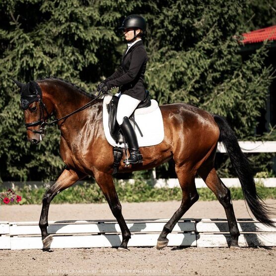 Очень человекоориентированный, имеет отличную психику, быстро идет на контакт и учится новому. Работается в выездку, имеет хорошие движения. Имеет стартовый опыт по ездам для лошадей 4х лет. Имеется вет.чек.
