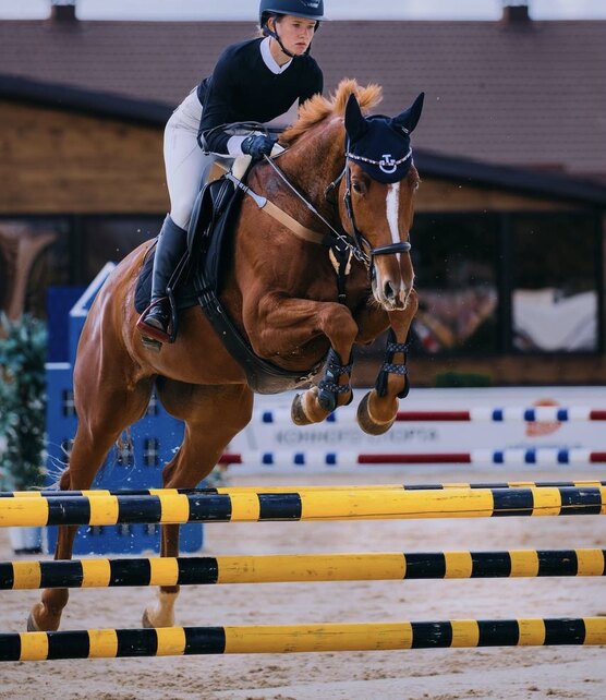 Старты - маршруты до 115 см. Дома - одиночные до 135 см. Также знает боковые элементы. Душевная, слушает всадника, не играет. Ходит хвостиком за человеком.