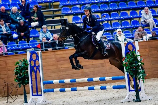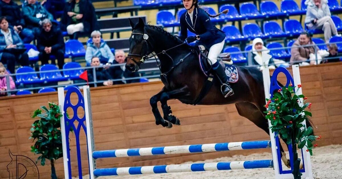 Украинской верховой породы, (Инспектор - Икибана). Поздней заездки. Работали только в направлении конкура. Стартовый опыт до 100 см. На барьеры не смотрящая, честно идёт. В работе у КМС по троеборью. В полях ведёт себя абсолютно адекватно, знакомили с троеборной водой. Мягкая на рот и шенкель. Чуткая к посадке всадника.