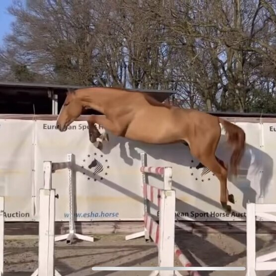 Отец KASHMIR VAN SCHUTTERSHOF(конкур 160см) от NABAB DE REVE(конкур 160). Мать ARABELLA(конкур 140см) от ARGENTINUS(конкур 150см). Маршруты до 100см. Планирует начать стартовать. Крупный, сильный жеребец в спорт. На фото отец.