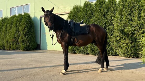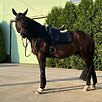 Беспроблемная лошадь во всех отношениях, все манипуляции спокойно переносит(куется на горячую, бреется, ездит в коневозе), гуляет в леваде (очень спокойно), ходит в шагалку, ходит пастись на недоуздке, бегает на корде, по жердям, работает на вожжах, работает в руках, в т.ч. проходит начальную подготовку к пиаффе в руках