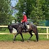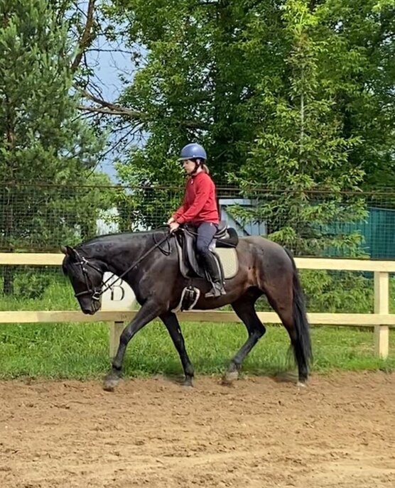 Работает на плацу в поле/лесу три аллюра, справляется девочка 9 лет. Не форсирован, в основном гуляли верхом в полях для души.