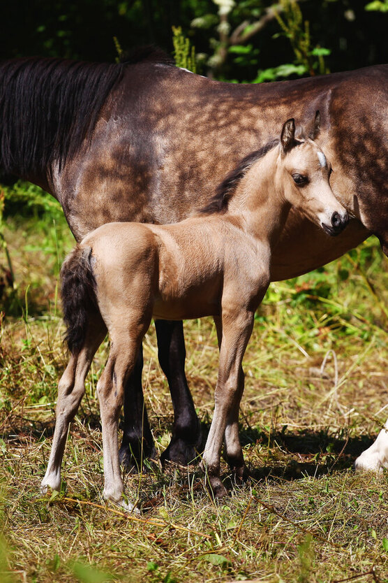Жеребчик секции В, буланой масти, дата рождения 26.06.25, нарядный харизматичный, очень любит показать себя, на просторных движениях.
