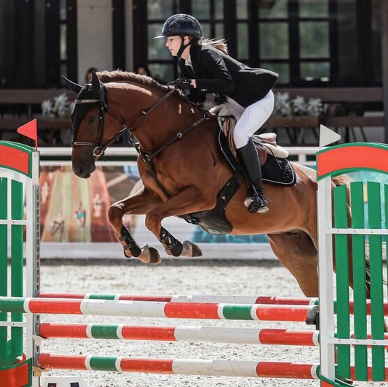 Старты - маршруты до 90 см. Дома - маршруты до 110 см, готовится выше. Обладает мягким, сильным и техничным прыжком, на барьер идет спокойно и уверенно. Работает на любых площадках. Адекватный, безопасный. Ласковый, очень лизучий.