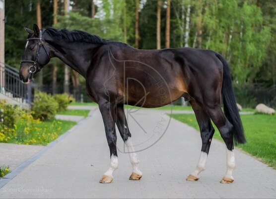 -Полукровная порода (мама — ганноверская, отец — французский сель). Отличные движения от природы. В стабильном спортивном тренинге.