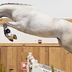 Ставится на корду, не заезжен, но подсаживались - воспринял спокойно. Напрыган в шпринте до 110 см, выше не ставили. Приучен ко всем бытовым манипуляциям. Перспективен в большой спорт.