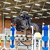 Стартовый опыт в конкуре с высотой препятствий до 115 см. под ребёнком. Дома прыгает до 125 см. На барьеры не смотрит, прыгает всё. На новых площадках ведёт себя спокойно и адекватно, ничего не боится.