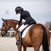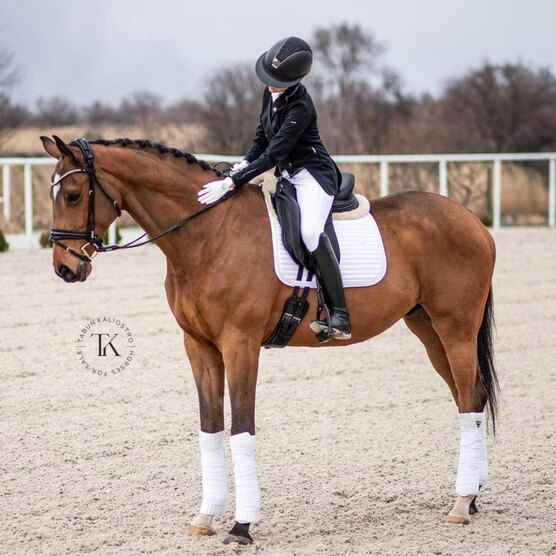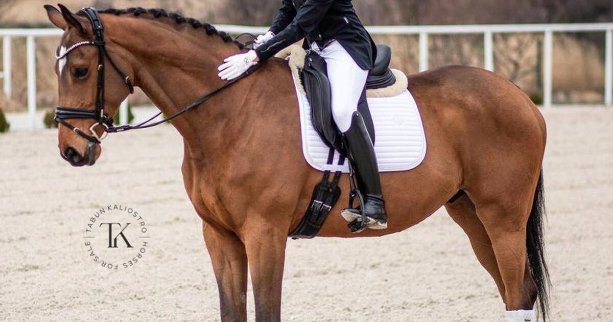 В родословной имеются: Buddenbrock, Sixtus, Habicht. Заезжен в 2023 году. Очень безопасный и добрый. Имеет три правильных аллюра. Уровень подготовки: детские езды, готовится к юношеским ездам. Делает принимания, уступки, осаживание, контргалоп. Имеет активные задние ноги, галоп в горку, летящую рысь, шаг 3 - 4 копыта заступ.