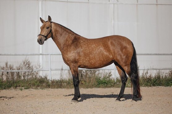 Буланая андалузская кобыла 2020г.р, в/х165см, растёт. Крупная, широкая на хороших движениях. Красивая голова с лёгкой горбинкой. Качественное выращивание на хорошем сене и кормах, живёт в табуне с многочасовым выгулом. В регулярном тренинге по системе Equi Flow, готовится к заездке, обучается трюкам. Испанские документы.