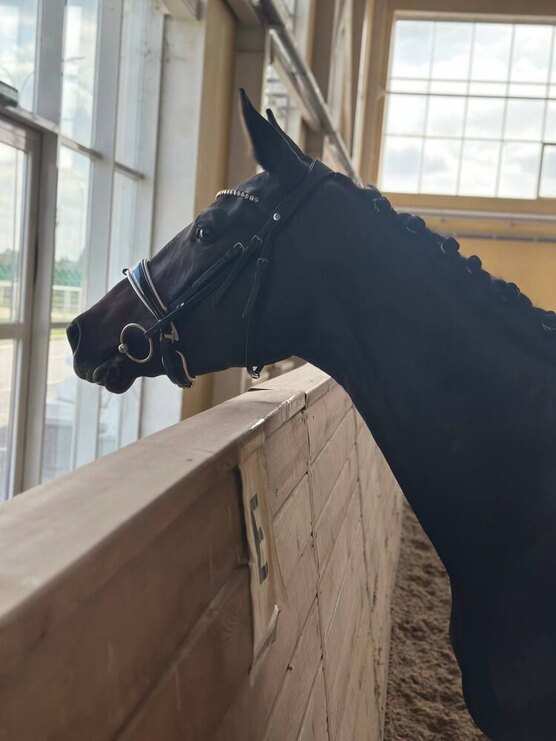 Находится в тренинге молодой лошади, не форсируется, обтянута, проходит начальные этапы заездки, пробовали прыгать на свободе.
