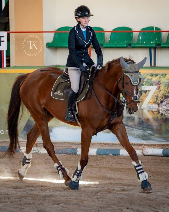 Отец - Питсбург, мать - Сербия. Спокойная, приятная, бронебойная, абсолютно уравновешенная психика. Прыгала связки до 110 см, в упражнениях до 120 см, маршруты 105 см. Возит детей. Ходит в поля и леса, не боится никаких барьеров. На прыжках в меру импульсивная. Подойдет под ездящего ребенка.
