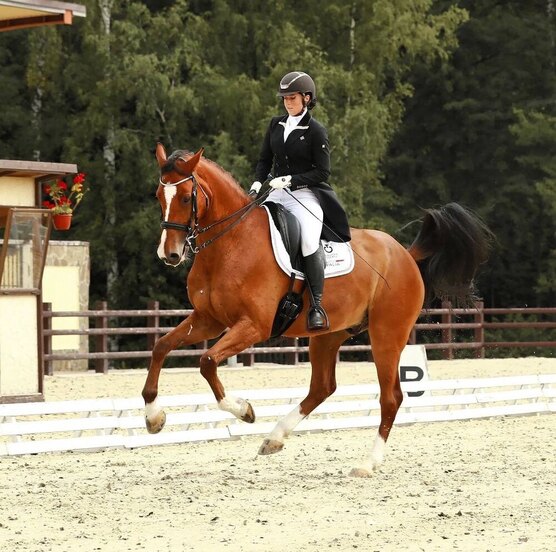 - Амплитудный, с тремя правильными аллюрами, активный, прощает ошибки всадника. Контактный и дружелюбный, без денниковых пороков.