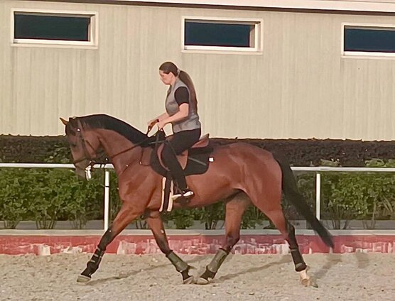 Заезжена зимой 2025, но в верховой работе с июня 2025. Бегает 3 аллюрами под всадником. Сбалансированная, обладает ритмичными движениями, энергичная. Сообразительная, очень общительная. Мягкая на повод, хорошо слышит шенкель. Ничего дурного не делает.