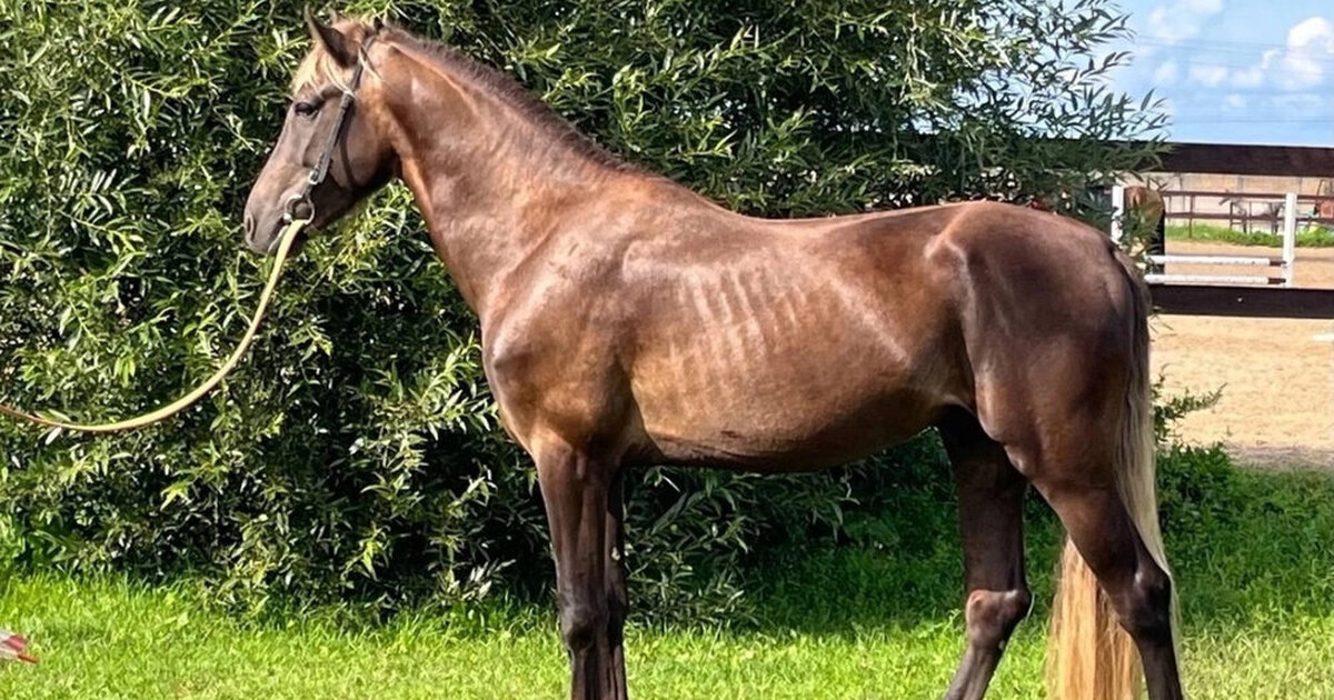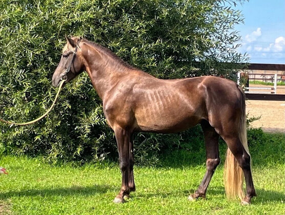 Очень эффектный парень верхового типа, будет отличным другом и партнером для любительского спорта или души. Обладает серебристо-вороной мастью, подтверждён ген гетерозиготный. Находится в стадии заездки, шагает под седлом. Пробовали напрыгивать на свободе, хорошо себя проявил. В руках адекватный. За человеком ходит как хвостик. В силу возраста может поиграть с человеком, но не ударит и не махнет ногой в него. Работает на разных площадках (бочка открытая и закрытая, плац, поле). На других лошадей не обращает внимания. Все манипуляции переносит без проблем. Без нареканий по здоровью. Есть рентгены 2023 г.