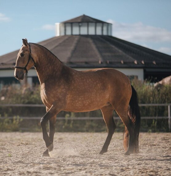 -Качественное выращивание на хорошем сене и кормах, живёт в табуне с многочасовым выгулом. В регулярном тренинге по системе