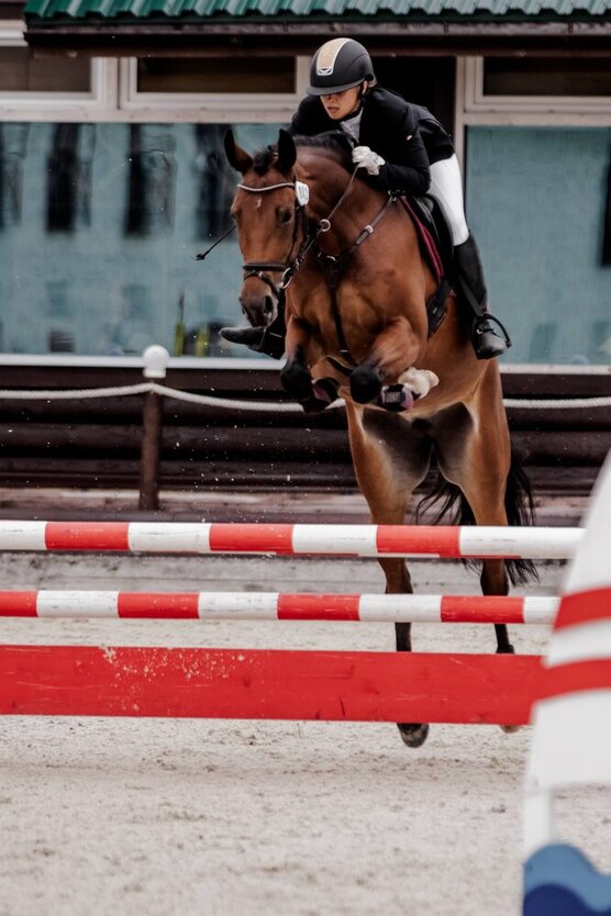 Очень умная, быстро учится новому, выручает на прыжках. Работает согласно возрасту.