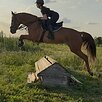 Поздней заездки. Старты - маршруты до 85 см. Дома - одиночные до 120 см, шпринт до 115 см, знаком с троеборными барьерами. Ничего не боится, прыгает все. Адекватный, ласковый, контактный, легко учится новому.