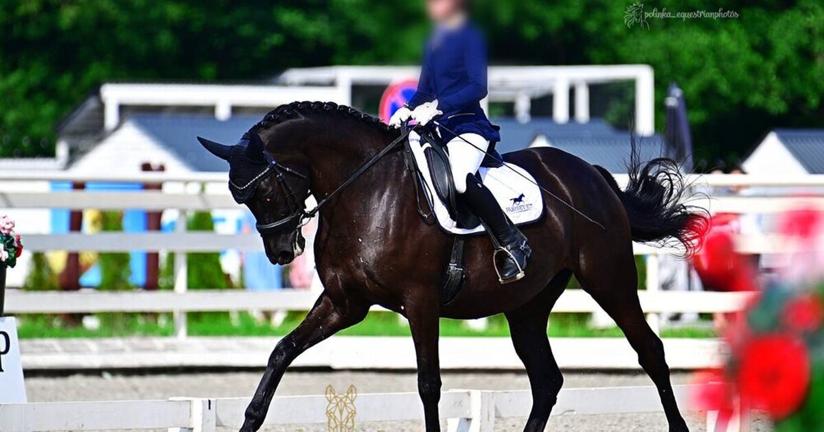 Очень элегантная лошадь с красивой головой, на правильных движениях.
