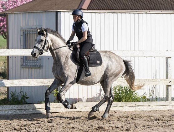 Заезжен в марте 2025. На данный момент обучается базовой выездке под седлом. Напрыган в шпринте до 130 см. Обладает хорошим и техничным прыжком.