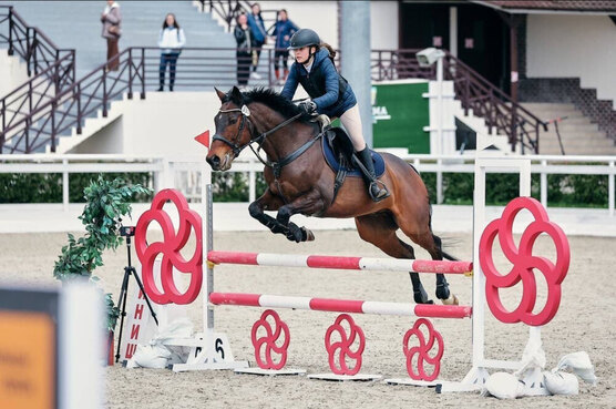 Выступает в маршрутах до 120 см под подростком, дома прыгает выше.