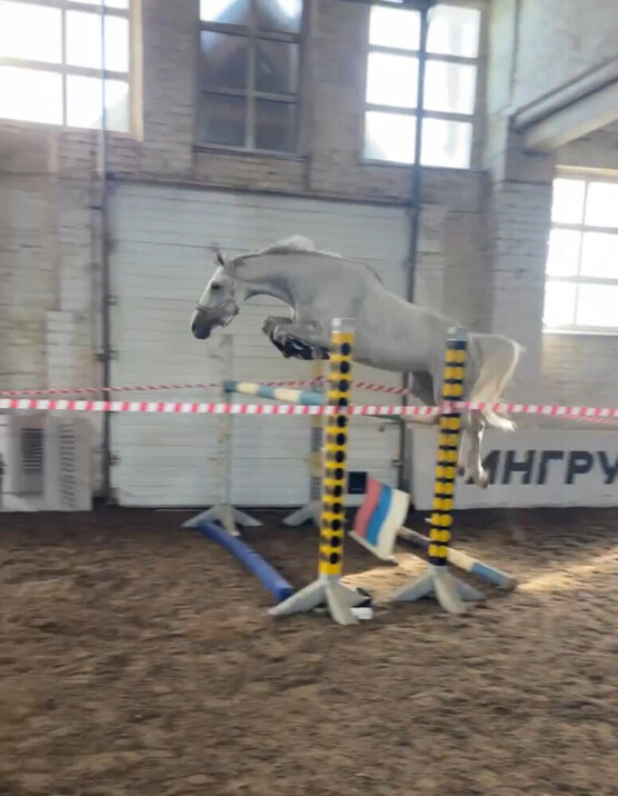 Кобыла сильная, не под слабого всадника, боится встречных. Есть опыт старта под 13-летним ребёнком по маленьким высотам.