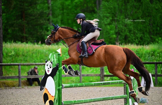 Стартовый опыт в маршрутах до 95 см, дома до 110 см, способна прыгать выше.