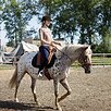 Проходила тренинг по рабочей выездке. Три уверенных аллюра под седлом, уступки, плечо внутрь, пируэт на шагу, сайд-пасс. Работается и в трюки - знает свечку, трапецию, поклон, тумбу, в процессе балансе на заду.