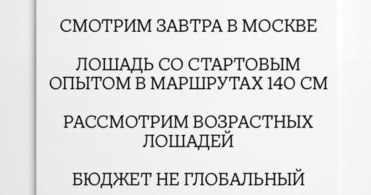 Работаю в команде с физиотерапевтом (услуги оплачиваются отдельно). График работы 5/2(пн-пт). Работаю с коноводом. Буду рада знакомству со спортсменом/коневладельцем, кто разделяет вышеупомянутые ценности и готов развивать себя и свою лошадь.