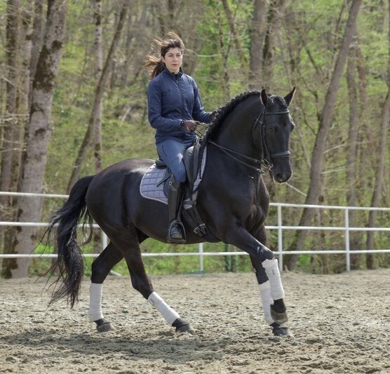 Старты - МП, СП. Дома - элементы испанской школы выездки, работает на вожжах, знает множество трюков. Сейчас бегает ППД под ребенком. Быстро учится, любит общение. Сильный, выносливый. В руках строгий, под верхом адекватный. Отличный вариант в производители: кроет аккуратно, дает экстерьерных жеребят.