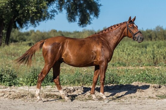 Заезжен весной 2025 г. Проходит базовую подготовку под седлом. В шпрингартене напрыган до 140 см. Работается согласно возрасту, не форсируется.