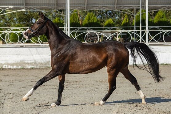 Перспективна в выездку. Поставлена на корду, готовится к заездке. Очень приятная в работе, лошадь-душа.