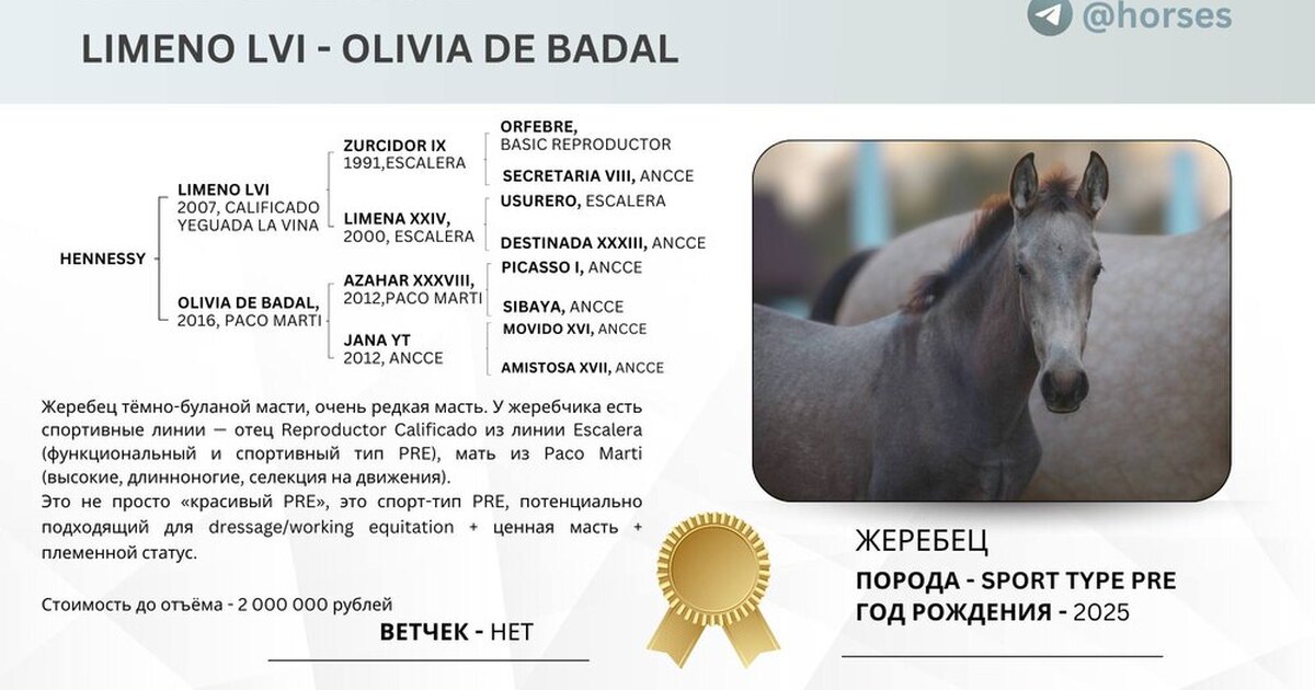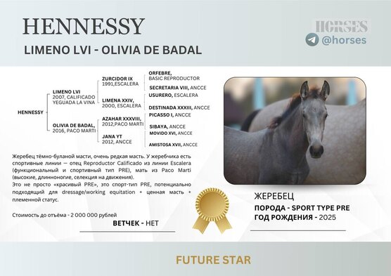 PRE — не классическая «спортивная» порода в плане олимпийских дисциплин (как голштин, KWPN и т.п.), но внутри PRE существует разделение на линии спортивного типа (Deporte). Отец Hennessy как раз из хозяйства Yeguada, которое известно селекцией высокой функциональности: