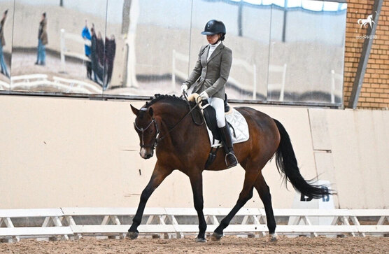 Проходит подготовку молодой лошади, поставлена правильная база, выступает езды по 4-хлетним лошадям.