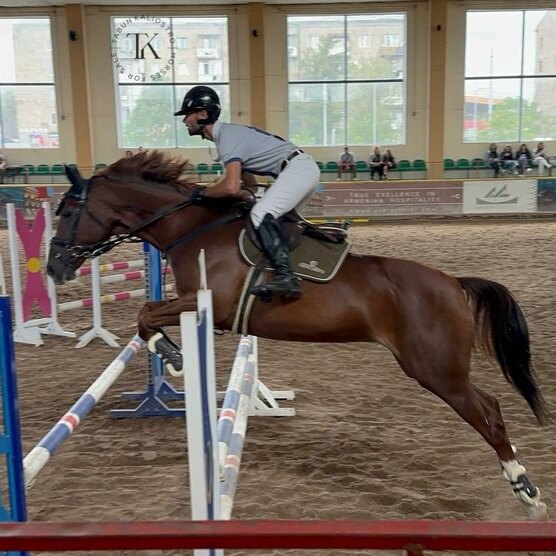 Спокойная, приятная, бронебойная, абсолютно уравновешенная психика. Прыгала связки до 110 см, в упражнениях до 120 см, маршруты 105 см. Возит детей. Ходит в поля и леса, не боится никаких барьеров. На прыжках в меру импульсивная. Подойдет под ездящего ребенка.