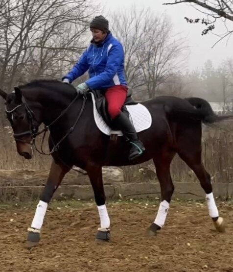 Старты - ППД А. Дома - принимания, уступки, полупируэты, учит менку. Находится в выездковом тренинге у МС. Обладает просторными движениями, хорошим заступом на прибавках. Сосредоточена на работе.