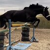 Дома - маршруты до 70 см, связки до 100 см, шпринт до 140 см. Обладает железобетонной психикой. Не жеребцует, спокойный. Удобный в быту, очень ориентирован на человека, ласковый. Работал в конкурном направлении под ребенком.