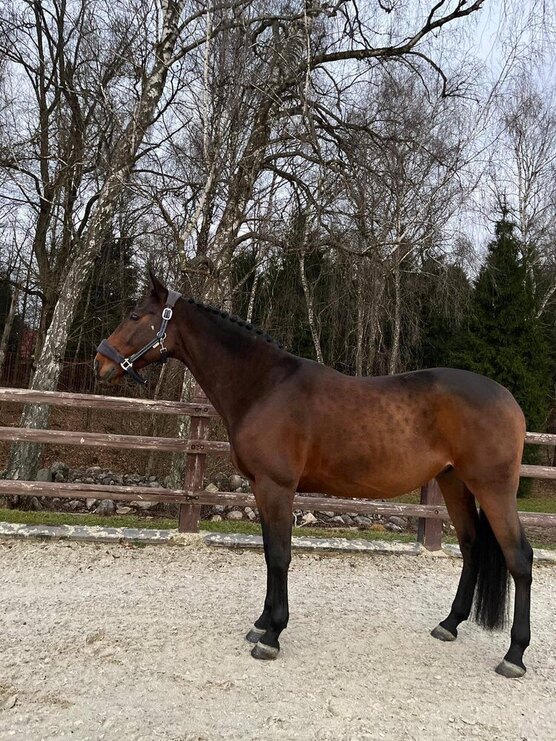 Находится в конкурном тренинге, стартовый опыт в маршрутах до 90 см, почти всегда в призах, дома одиночные до 110. Выезжает в поля/лес.