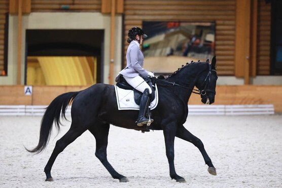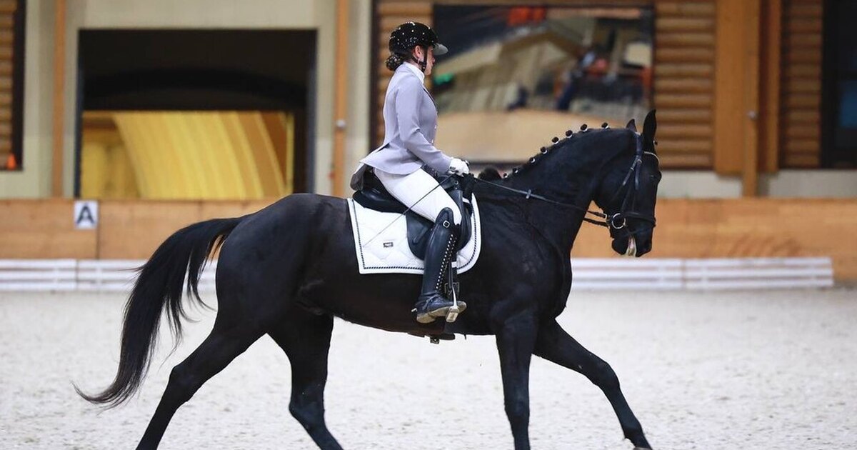 Находится в выездковом тренинге, три аллюра, переходы, потихоньку включают боковые в работу.