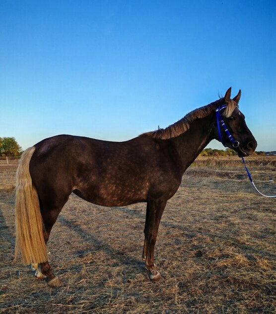 Легкообучаема, обладает легкими, просторными движениями. Добрая и ласковая кобыла, приучена ко всем манипуляциям.