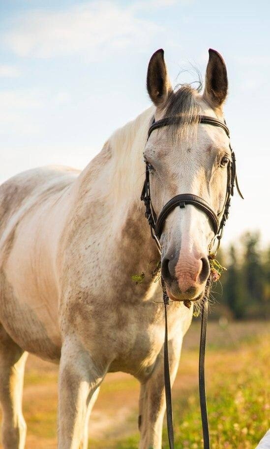 Старты - маршруты до 80 см, Юношеские езды (привезла ребенку разряд). Дома - маршруты до 100 см, одиночные до 115 см. Честная, выручает, не смотрит. Знакома с троеборными барьерами. Раньше под берейтором делала пассаж, пиаффе, серийные менки. Мягкая на средства управления, отлично работает на кордео. Спокойно ходит в поля, стабунена.