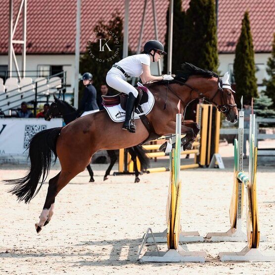 Душевная, не встает, не закидывается, всегда поможет и выручит. Стартовый опыт до 95 см, дома до 120 см, прыгает системы, канавы, гимнастику, ставили всякие страшилки под барьеры, вешали попоны на барьеры, ничего не боится. Умеет уступки, плечи, одиночные менки. Можно рассмотреть в троеборье. Не любит других лошадей, но в работе никак не проявляется. Все манипуляции без проблем. Имеется паспорт ФКСР, розовое племенное свидетельство ВНИИК.