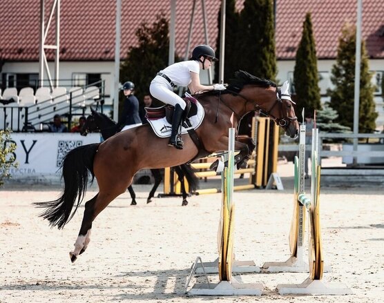 Старты - маршруты до 95 см. Дома - маршруты до 120 см (выше не ставили), знает боковые, менки. Прыгает системы, канавы, гимнастику, ставили всякие страшилки под и на барьеры - ничего не боится. Очень душевная кобыла, всегда поможет и выручит. Можно рассмотреть в любую дисциплину.