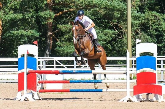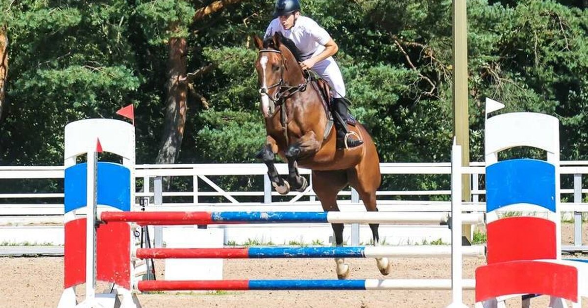 Стартовый опыт в конкуре с высотой препятствий до 110 см. Дома прыгает связки до 125 см.