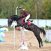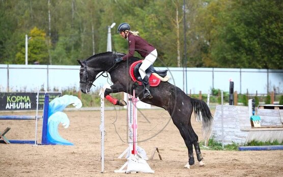 • Поздней заездки, не форсируется. На свободе напрыган до 130 см - хороший, выразительный прыжок. Уже выступает по маршрутам до 80 см, дома уверенно делает метр и связки 110.