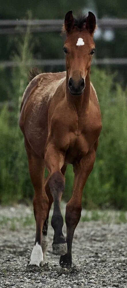 Высокий и крупный жеребчик. Обладает спокойным и размеренным характером. Очень общительный и ласковый. Имеет качественные природные аллюры в горку, особенно хорош галоп.