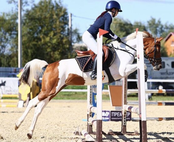 Старты - маршруты до 60 см, кавалетти (под ребенком). Активная, прыгучая кобыла. Общительная, дружелюбная.