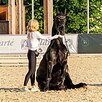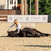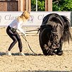 Добрый, ласковый, хорошо реагирует на голос, очень контактный. Не выступал, выезжен до детских езд. Возит любителей, мужчин и детей. Умеет поднимать ноги, ходить задом, кланится в руках и верхом, лежать, сидеть.