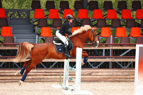 Старты - маршруты 85 см (в призах). Дома - маршруты до 100 см, выше не ставили; также прыгает троеборные барьеры. Дружелюбный, общительный, честный в работе. Мягкий на средства управления. Лошадь одного человека.