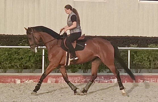 Заезжена зимой 2025, но в верховой работе с июня 2025. Бегает 3 аллюрами под всадником. Сбалансированная, обладает ритмичными движениями, энергичная. Сообразительная, очень общительная. Мягкая на повод, хорошо слышит шенкель. Ничего дурного не делает.